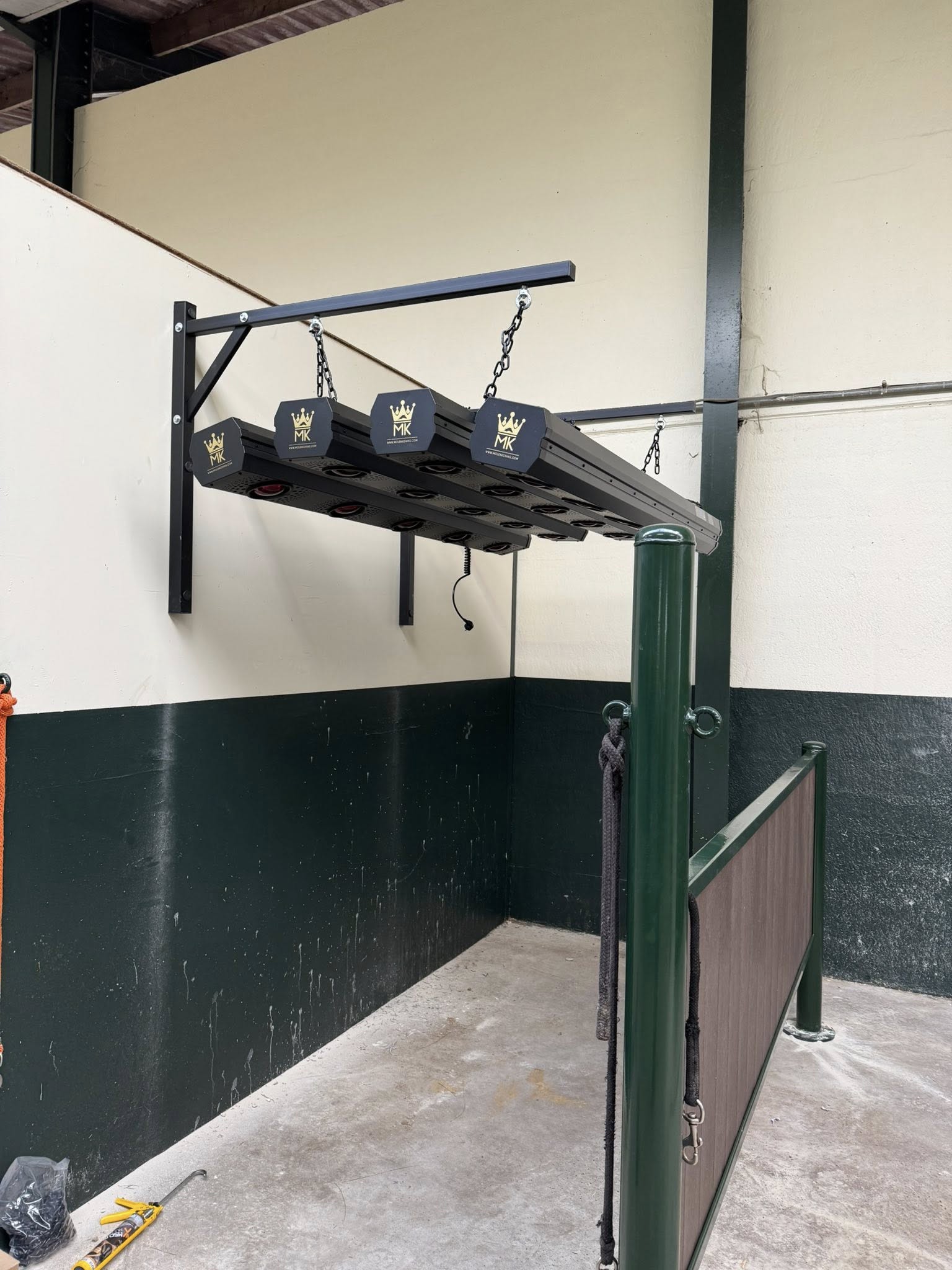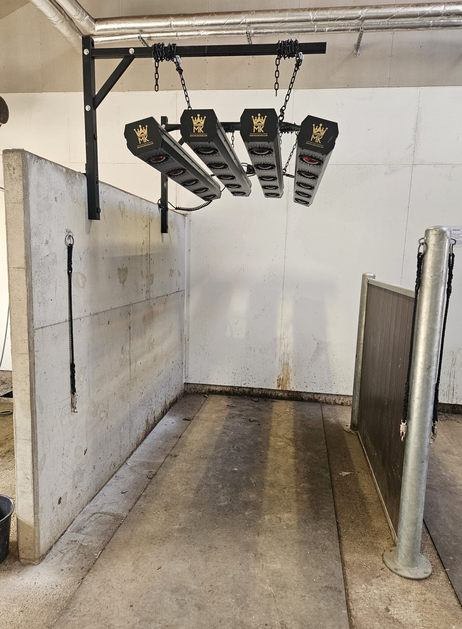 Da MK raccomandiamo una distanza tra le lampade del solarium e le spalle del cavallo di almeno 50 cm. Pertanto, l’altezza dell’installazione deve permettere questa distanza di sicurezza. Da MK disponiamo di un sistema di sollevamento automatico per regolare la distanza tra le lampade del solarium e le spalle del cavallo.